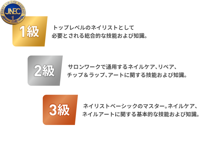 - 1級:ネイリスト技能検定試験2級取得者のみ